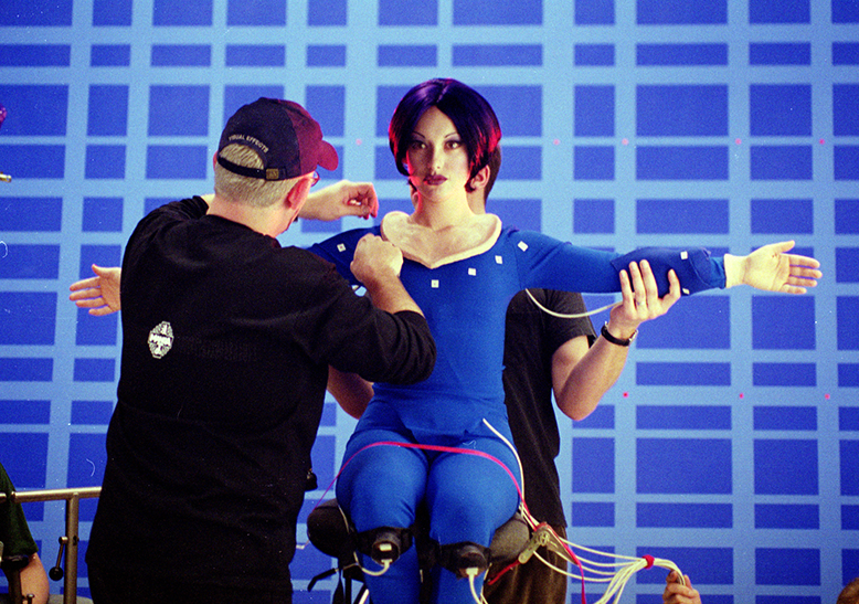We ambitiously combined motion capture with live action bluescreen to replace the body of our lead actress. Prosthetics were also used to achieve the faceted bodies of the androids.